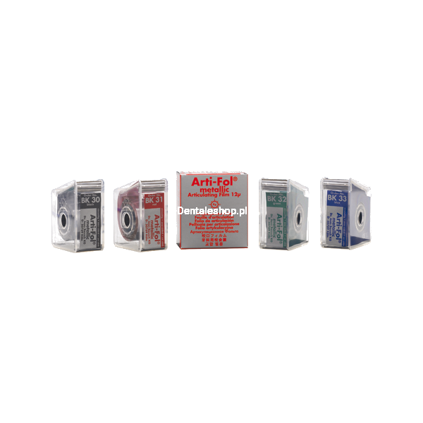 Arti-Fol® Metallic 12μ ist eine Hightech-Kontrollfolie mit deutlich verbesserten Eigenschaften. Diese Kontrollfolie besteht aus einer metallisierten Polyesterfolie (Shimstock-Folie) mit einer dünnen Dicke von 12μ. Die Kombination einer Farbstoffschicht und einer metallisierten Polyesterfolie hat bei einigen Anwendungen deutliche Vorteile. Die Folie zeichnet sich durch eine sehr gute Farbübertragung aus. Besonders auf Porzellan und polierten Metalloberflächen sind die Kontaktpunkte deutlich. Dank der Verwendung von metallisierter Folie wurde das Problem der statischen Elektrizität weitgehend eliminiert. Die Folien lassen sich ganz einfach ohne Pinzette anbringen. Das Material ist außerdem sehr reißfest und kann daher erfolgreich zur Kontrolle der Kaufläche des Zahns eingesetzt werden. Im Gegensatz zu herkömmlichen Metallic-Folien markiert Arti-Fol® Metallic genau die Kontaktpunkte. Dank der metallisierten Rückseite der Folie ist die Seite mit der Farbschicht gut zu unterscheiden. Arti-Fol® Metallic eignet sich dank seiner hohen Reißfestigkeit und geringen Materialstärke ideal zur Kontrolle von Kontaktpunkten beim Aufsetzen von Brücken oder Kronen. Mit der neuen Arti-Fol BK 145 Pinzette lässt sich die Folie einfach an den Kontaktstellen anbringen. Arti-Fol® Metallic ist in vier Farben erhältlich. Mit der neuen Arti-Fol BK 145 Pinzette lässt sich die Folie einfach an den Kontaktstellen anbringen. Arti-Fol® Metallic ist in vier Farben erhältlich. Mit der neuen Arti-Fol BK 145 Pinzette lässt sich die Folie einfach an den Kontaktstellen anbringen. Arti-Fol® Metallic ist in vier Farben erhältlich.