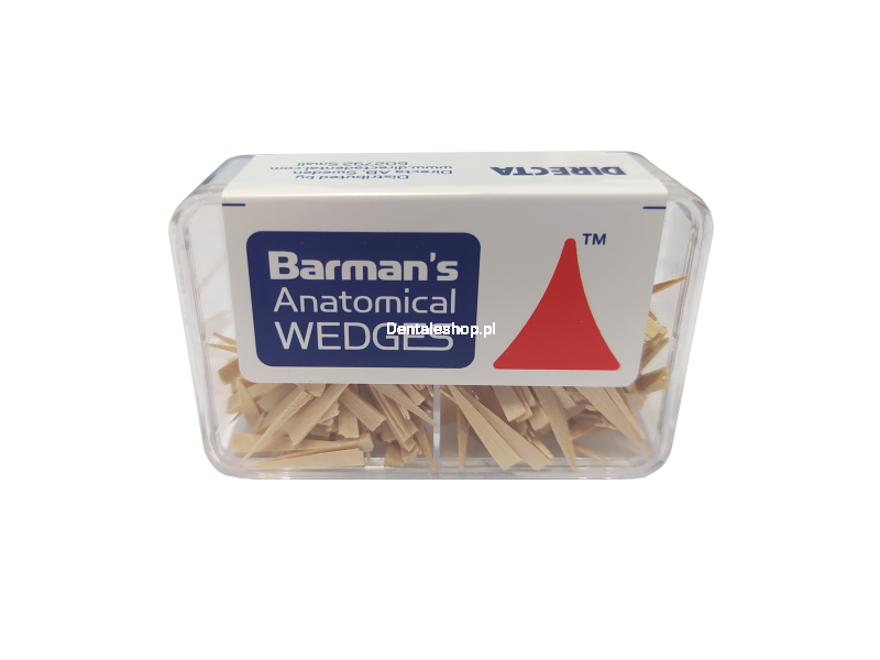 Die anatomischen Keile von Barman ermöglichen aufgrund ihrer anatomischen Form bessere und sicherere Eingriffe. Ihre Aufgabe besteht darin, die Matrizen in der richtigen Position zu fixieren und eine bessere Trennung vom Nachbarzahn zu erreichen. Der Keil ist zunehmend dicker als das spitze Ende, sodass er in die meisten Räume passt. Sie sind in zwei Größen erhältlich: klein (natur) und groß (grün). Hergestellt aus Birkenholz, was den Keil weich und flexibel macht.